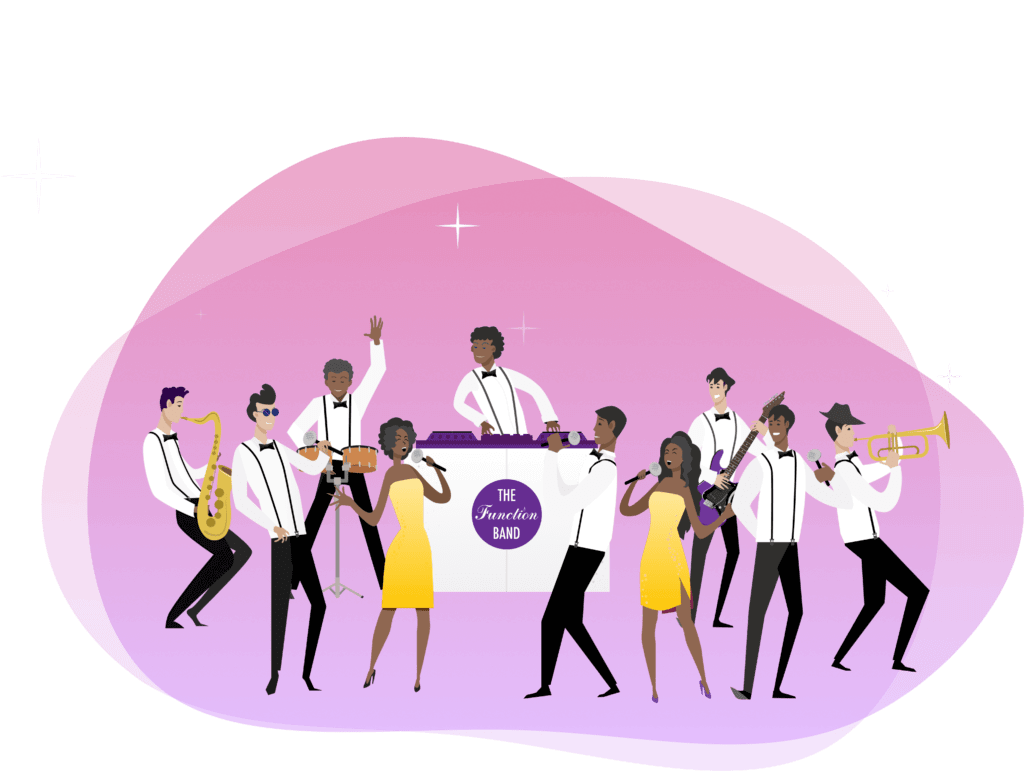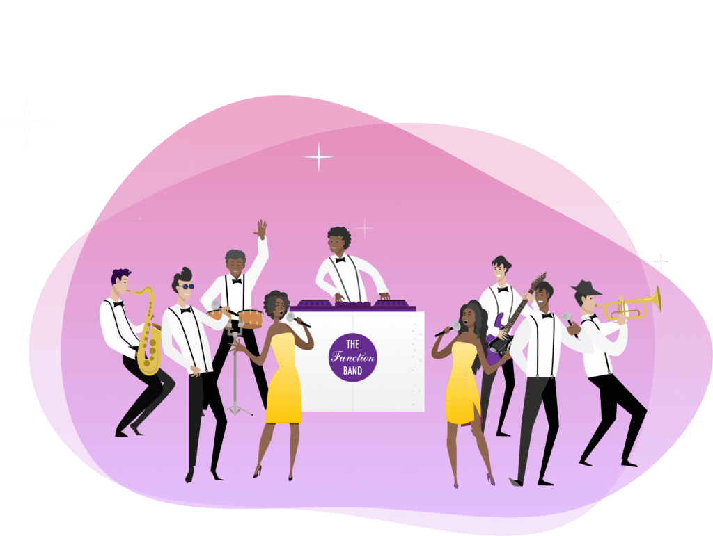 The Function Band DJ LIVE is an extremely popular set up, more compact than our ShowBand but no compromise on sound and experience! We can provide any size band from a 6-20 piece.